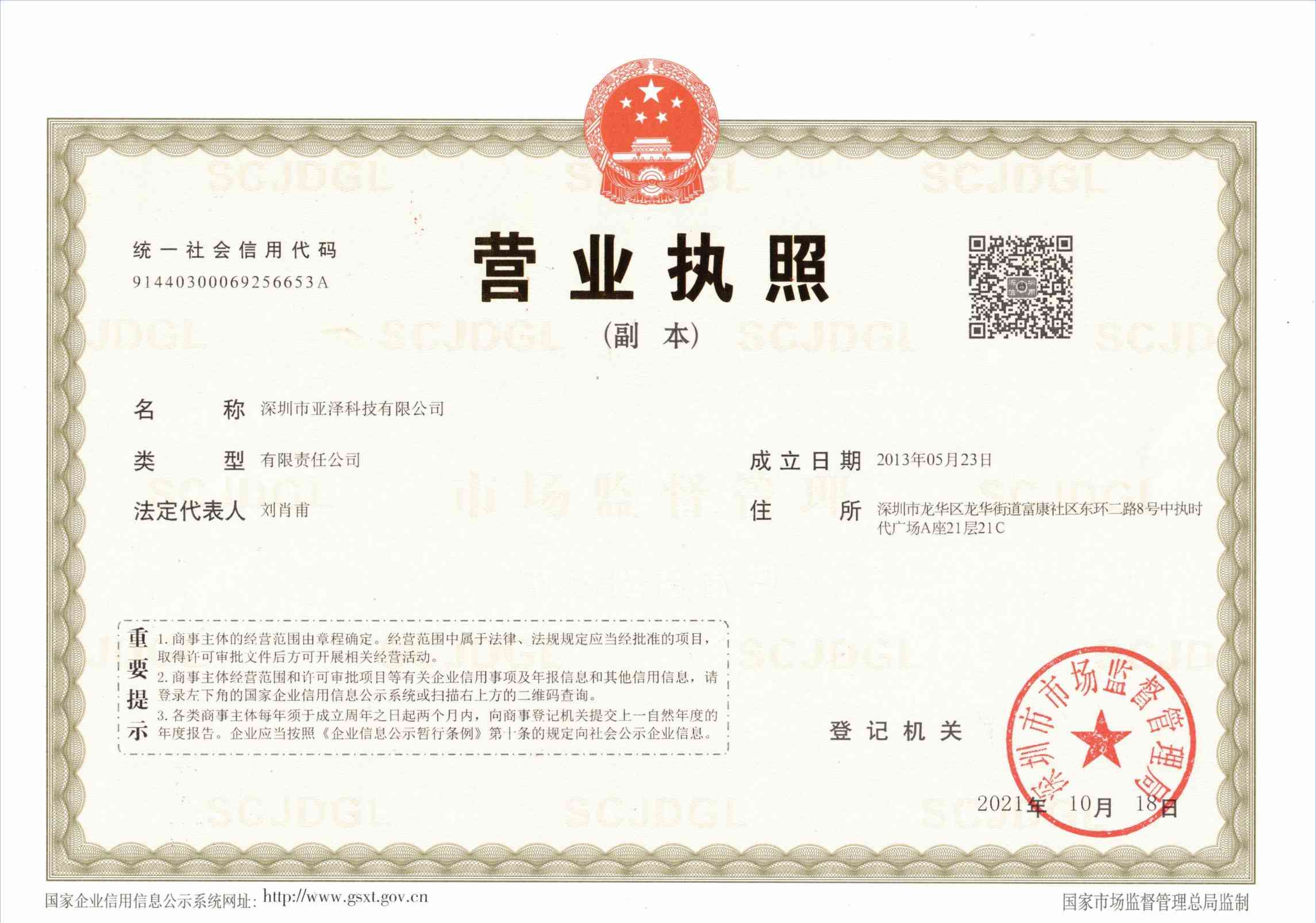 • 深圳亞澤營業執照